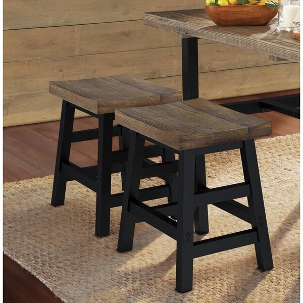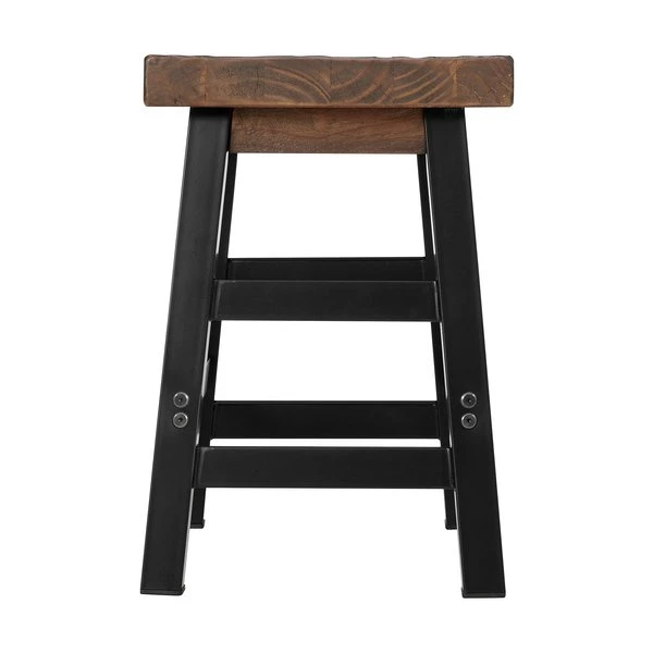 The Pomona collection features the exquisite workmanship of a solid wood top with metal legs that will last for years to come. Each piece is constructed of solid pine wood and finished to have the appearance of reclaimed wood. The reclaimed wood finish highlights natural wood variations such as cracks and knots which add to the piece's character. Any item in this collection will add to the rustic industrial style of any space. 20"H stool in modern farmhouse construction with its solid, rustic Pine wood seat and strong black metal legs