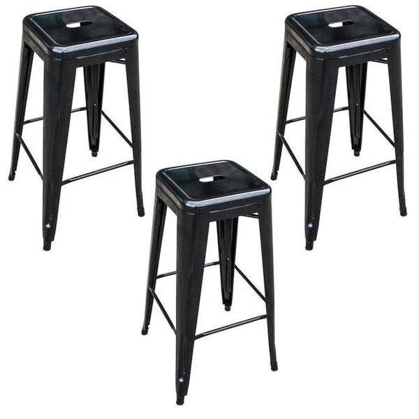 These AmeriHome Metal Bar Stools are durable enough for use in the shop. and stylish enough to use in the kitchen. game room. bar. basement. dorm room. or loft. Ideal for small spaces. the bar stools easily and neatly stack together. making them easy to stash out of the way for storage. A handle in the seat makes the stools easy to pick up and move. Lightweight and sturdy. each stool weighs only 12.5 lbs.. but is strong enough to hold up to 330 lbs. Each Metal Bar Stools has a brace under the seat that provides additional support and stability. No-mar rubber feet keep them from sliding and scratching hardwood floors. They bar stools are painted with a scratch-resistant powder coat paint finish. Each Bar Stool stands 30 inches tall with a seat measuring 12 in. L x 12 in. W. FeaturesIndustrial. modern look for kitchen. dorm. or shopScratch-resistant powder coated paint finishEasily stacks for convenient storageX-brace support under the seat for stability and durability3 PieceSpecificationsColor: BlackSeat height: 30 in.Seat size: 12 in. L x 12 in. WWeight Capacity: 330 lbsDimension: 17 in. W x 17 in. D x 30 in. HWeight: 30 lbs