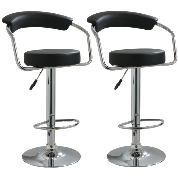 This AmeriHome 2 Piece Adjustable Height Bar Stool Set includes two retro style, adjustable height black vinyl bar stools. This 2-piece bar stool set is reminiscent of the days of diners and drive-ins, and features a polished chrome base and a black vinyl seat and back rest for a hint of vintage retro style. Designed for maximum comfort, each bar stool features a large 14" wide, padded, 360° swivel seat, a padded vinyl back, a built in footrest and an adjustable seat height of 24.75" to 32.75".