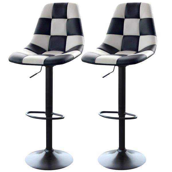 The AmeriHome 2 Piece Racing Bar Chair Set is perfect for a game room, garage, man cave, or finished basement. A white and black patterned padded vinyl seat and a matte black base give this Racing Bar Chair Set the look of checkered flag. Includes 2 Racing Style Bar Chairs Adjustable seat height from 24" to 33" Maximum seat back height of 45.5" 17.5" W x 18.5" D padded black vinyl, 360° swivel seat 330 lbs. weight capacity