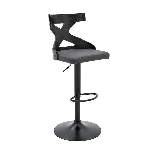 The Etienne Grey Faux Leather and Black Base Adjustable Swivel Barstool from Armen Living is the perfect barstool to invite into your beautiful home. The ornate x-designed back is unique and original. yet comfortable and reliable. The plush foam-padded cushion is perfect for long conversations and entertaining guests as it keeps them comfortable for as long as they are seated. The Etinne features a full 360-degree swivel function that increases the mobility of your stool. The adjustable gas lift can take you from counter height to bar height in an instant with ease. The wide chrome base is not only a great looking accent but practical as well – keeping you stable and secure as long as youre seated. Look no further for a beautiful. functional and easy to assemble furniture for your home. This piece of furniture requires assembly and comes with clear and concise step by step instructions that make set up a breeze!The design of the Etienne will make your jaw drop when you see it in person for the first time. The modern frame mixed with contemporary aesthetics is a masterpiece of a combination. This bar stool provides more stability with a large base that prevents any rocking or movement potentially caused by using the swivel or height adjustment features. In addition. this fantastic bar stool has a weight capacity of up to 250 pounds! This stool was designed with ergonomic principles;; shaping around your back with a wide seat for extra room. The soft foam-padded cushions offer extreme comfort. which helps to support and relax your back and body. SWIVEL STOOL – It can be tough crafting the perfect stool for our customers. we are always thinking of the most unique ideas for the best user experience. Providing these features is one way we can do this and help exceed your expectations. The wonderful full 360-degree swivel function allows for maximum mobility. The smooth glide swivel function allows you to change directions with ease. making this your new favorite stool in your home! SpecificationsCollection: EtienneUpholstery: BarstoolMaterial: Bentwood. Metal. Faux LeatherFabric Content: 100% PolyurethaneFinish: Matte Black FinishDimension: 18.00" x 19.00" x 38.00-46.00"Weight: 22 lbs