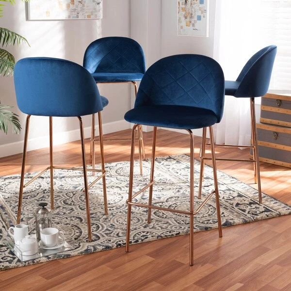 The simple elegance of the Addie bar stool easily enhances the atmosphere of any home bar or lounge area. The Addie is composed of chic rose gold-finished metal legs and a smooth velvet fabric upholstered seat. An eye-catching diamond stitch pattern on the backrest adds modern flair while maintaining the plush embrace of the seat. Requiring assembly, the Addie is fitted with ergonomic footrests on three sides. Minimalist yet stunning, the Addie bar stool is an easy addition to the modern home.