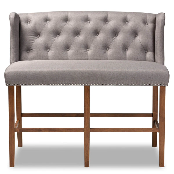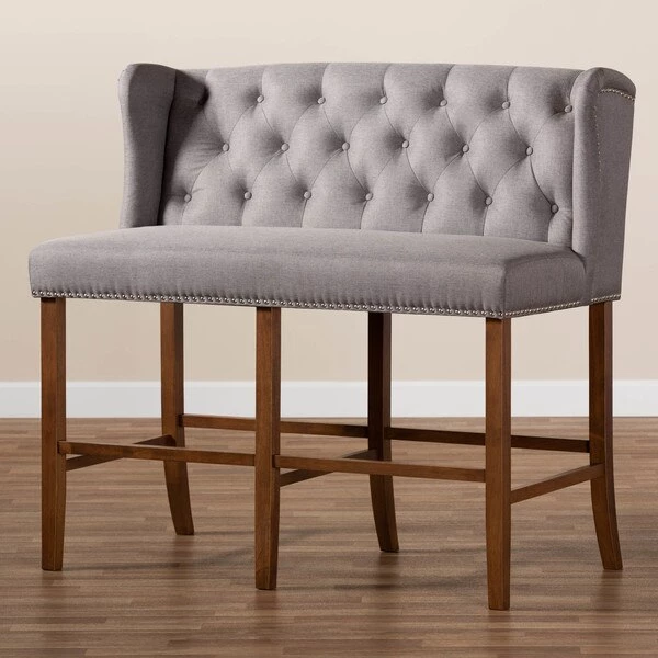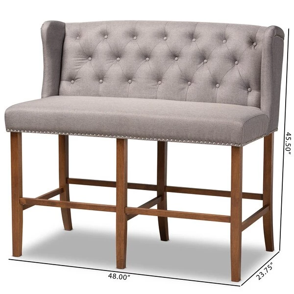 Host happy hour in your home with the Alira bar stool bench. Constructed from wood, this bench provides solid seating for two. The seat and back are upholstered in a soft neutral fabric and padded with foam for endless comfort. A built-in foot rest provides additional seating comfort. Elaborate button tufting on the back gives this bench a refined look, while silver nail heads highlight the elegant wingback silhouette. The Alira is well suited for both a kitchen or bar setting. The Alira bar stool bench requires assembly.
