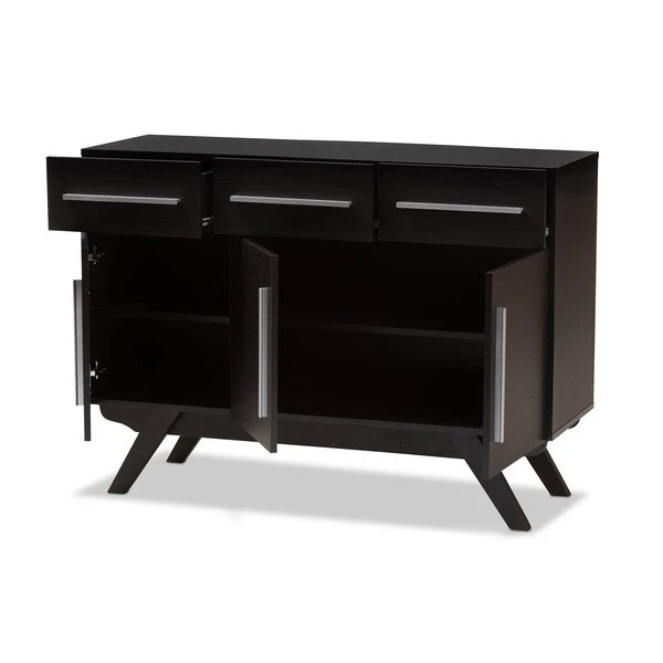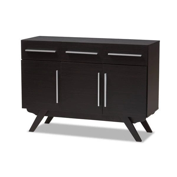 Sleek design with angular legs for sculptural design balancing, the Ashfield sideboard presents your everyday space with ample storage. Constructed of engineered wood and MDF boards for sturdiness, the sideboard features three upper drawers on pre-installed drawer slides and lower, closed cabinet for compact storage. Powder-coated handles offer a sleek and modern aesthetic in your space. Solid rubberwood legs provide strong structural support while the wide top surface suited perfectly to display dinnerware or ornaments. Walnut or espresso brown veneered finishing complements a range of interior palettes and styles, from retro and Scandinavian to coastal and urban styles. The Ashfield requires assembly.