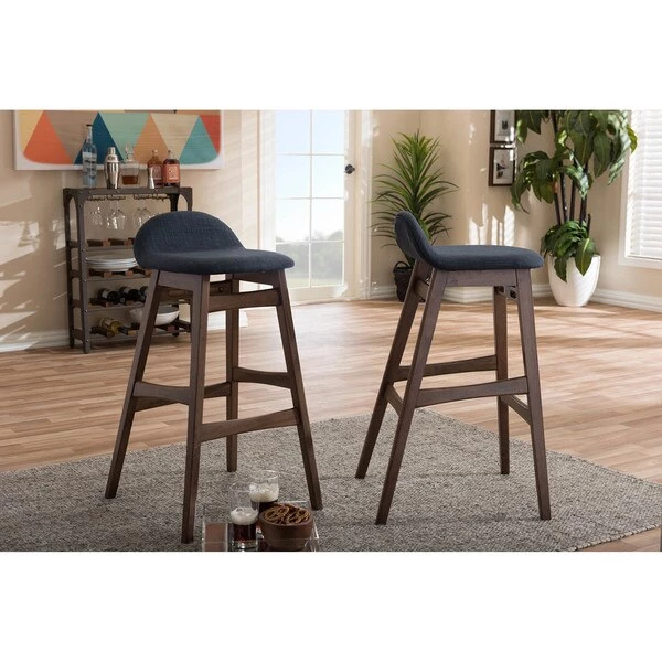 Infuse your home with everyday function and organic appeal with the Bloom Mid-century Retro Modern Scandinavian Style Dark Blue Fabric Upholstered Walnut Wood Finishing 30-Inches Bar Stool. This modern bar stool features a bold solid wood base that ensures long lasting strength, while the plush seat in dark blue fabric is small with supportive back rest. The built in footrest offers extra support. Bloom barstool is the perfect balance of comfort and style. The crisp clean lines and subtle curve is combined with supportive seating. A small cushioned seat with lipped edges and a low back rest keeps you comfortable and well supported, while a built in foot rest provides extra support. The barstool infuses the modern space with an innate style. The Bloom requires assembly.