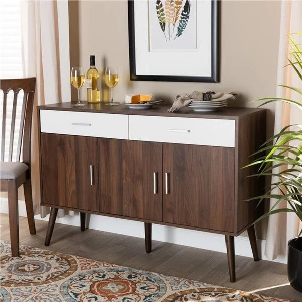 Clean lines and ample storage space make the Leena sideboard an easy addition to any dining room. Constructed from wood. this sideboard features a two-tone white and walnut brown finish for a cool. modern feel. Three doors open to reveal space to store plates and glassware. while two drawers provide room for silverware and linens. Inspired by mid-century modern design. the Leena features a low profile and splayed legs. Silver handles add a sleek touch. The Leena sideboard is made in Malaysia and requires assembly. FeaturesConstructed from rubberwood. MDF wood. engineered wood. and PVCTwo-tone white and walnut brown finishTwo (2) drawersTwo (2) storage compartments behind three (3) doorsSilver handlesAssembly requiredMade in MalaysiaSpecificationsColor: White & WalnutDrawer: 2-DrawerStyle: Mid-CenturyDrawer dimension: 2.7 x 20.66 x 12.1 in.Big shelf: 22.52 x 23.66 x 13.7 in.Legs Height: 9.76 in.Dimension: 32.28 x 47.24 x 15.31 in.Weight: 89.18 lbs