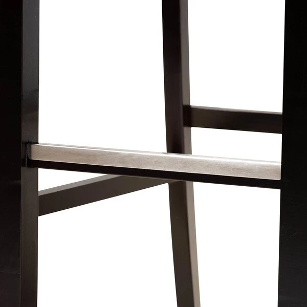 Terrific comfort dressed in modern style defines the Calista bar stool. The Calista is constructed from wood in a classic square frame. The bar stool is fitted with a foam-padded seat underneath a soft layer of fabric and features a striking cut-out design on its back. This piece requires assembly and is finished in a rich espresso brown that complements the light tones of the fabric. Sturdy silver metal is fitted on the front footrest, making the Calista bar stool well suited for both commercial and residential settings.