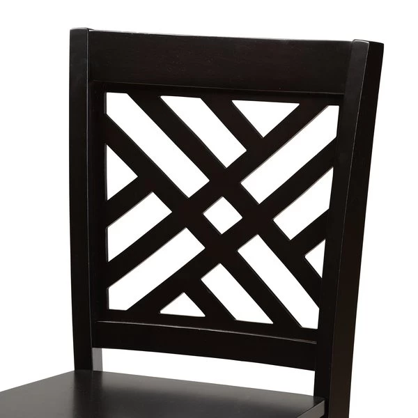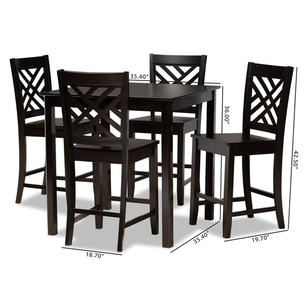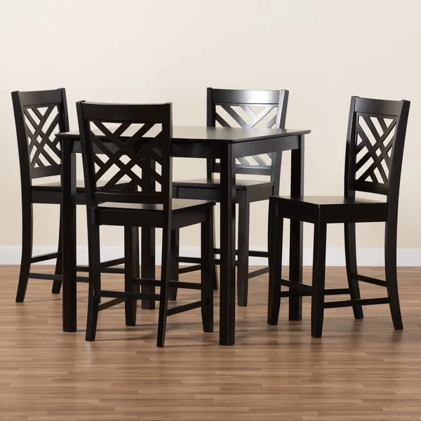 Redefine your dining space with the elegance and comfort of the Caron pub set. Made in Malaysia, this wooden set includes one table and four counter stools, each finished in a dark brown hue. Designed with both comfort and style in mind, each chair features a smooth, flat seat, as well as an exquisite cut-out design on its back. Requiring assembly, the square tabletop provides ample elbow room for each member of the table. Well suited for areas with limited space, the Caron pub set brings modern elegance to any home bar or lounge.