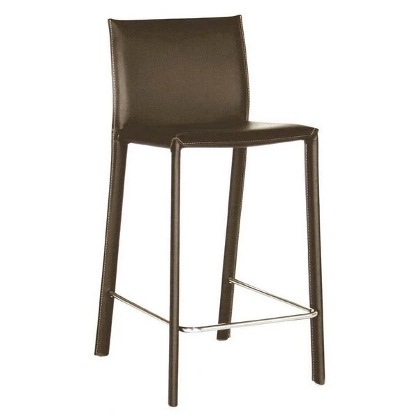 Leather counter stools constructed of a steel frame, durable bonded leather upholstery, white stitching, steel footrest and foam fill