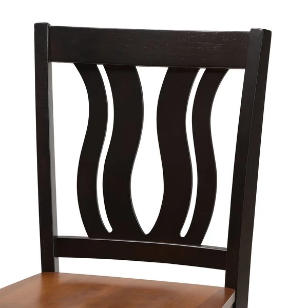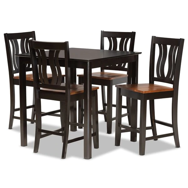 Furnish your dining room with the sleek and modern design of the Fenton pub set. Made in Malaysia, this wooden set includes four counter stools and one table showcasing a distinctive two-tone dark brown and walnut brown finish. Each stool features a unique, geometric cut out design for added visual appeal, while a scoop seat and footrest lend casual comfort. Requiring assembly, the square tabletop provides ample elbow room for each member of the table. Ideal for both casual meals and formal get togethers, the Fenton pub set enhances any dining experience.