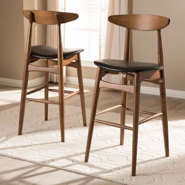 Finished in a sumptuous walnut brown, the Flora bar stool brings a warm feel to an interior pairing with a wide variety of modern and classical styled furnishings. The graceful lines of the bar stool is achieved through the expert craftsmanship of the distinctive curved and rounded edges along the sides, and the smooth grained texture of the chair. Designed for everyday living, this bar stool is supported by four tapered legs – each of which is set at an angle to create a modern profile while also enabling more legroom underneath. Constructed of solid rubberwood, the bar stool is upholstered in black faux leather with padded cushions. The bar stool requires assembly.