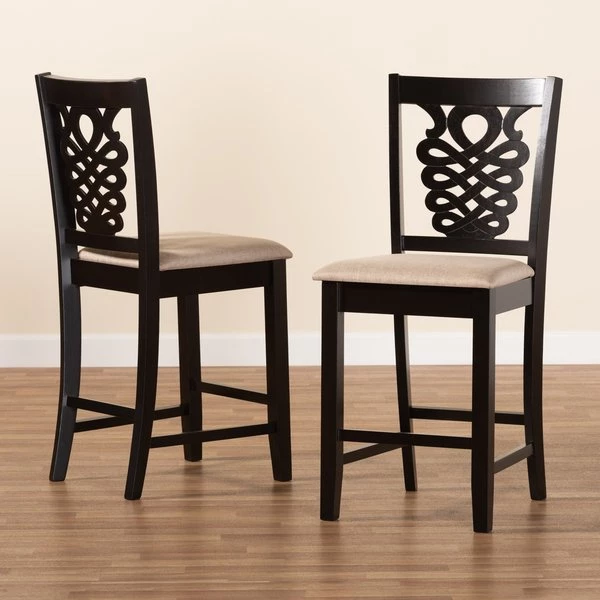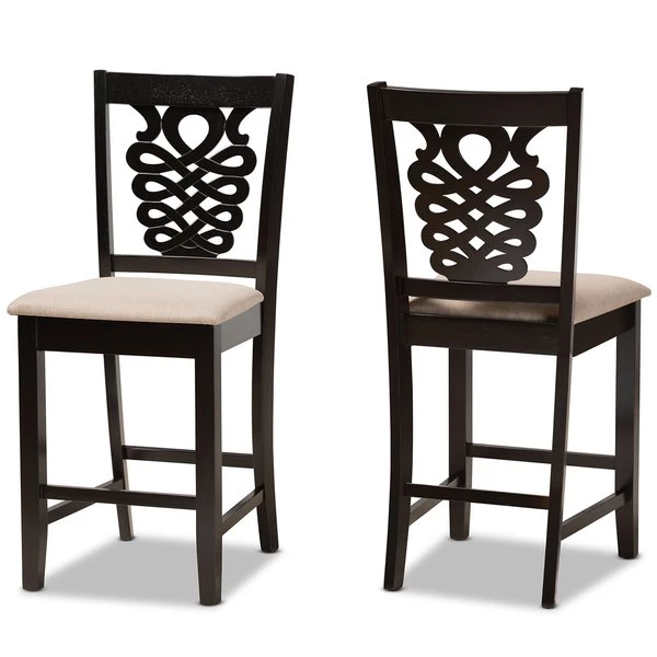Imbue your dining space with the elegance of the finely crafted Gervais counter stool. Made in Malaysia, this stool is comprised of a sturdy wood frame showcasing a rich dark brown finish. The Gervais is padded with soft foam and upholstered in smooth fabric for superb comfort. Requiring assembly, the backrest features a unique, intricate cut out design for enhanced visual appeal. Straight legs lend a touch of sleek, contemporary style, making the Gervais counter stool an excellent addition to the modern home.