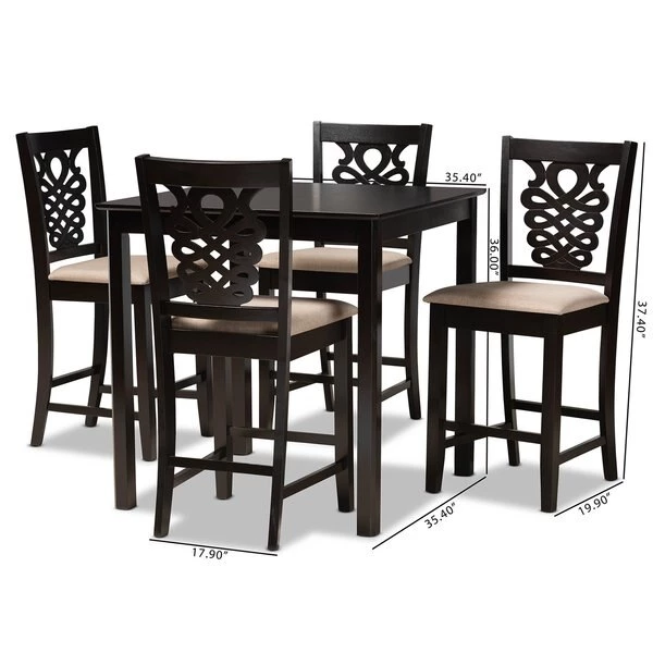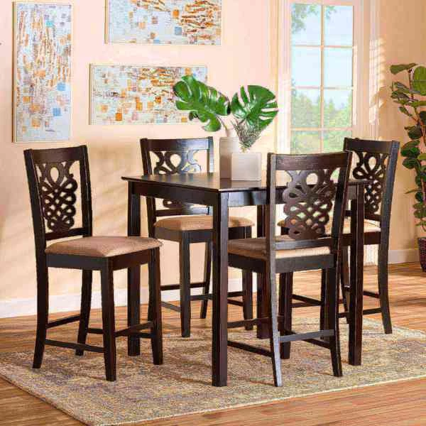 Imbue your dining space with the elegance of the finely crafted Gervais pub set. Made in Malaysia, this wooden set includes four counter stools and one table finished in a rich dark brown. Each stool features a fabric upholstered seat and footrest for casual comfort, while a unique, geometric cut out design on each backrest adds visual appeal. Requiring assembly, the square tabletop provides ample elbow room for each member of the table. An optimal balance of comfort and modern style, the Gervais pub set enhances any occasion.