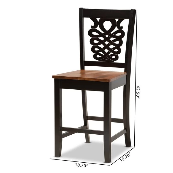 Imbue your dining space with the elegance of the finely crafted Gervais counter stool. Made in Malaysia, the Gervais is comprised of a sturdy wood frame showcasing a rich dark brown finish. The seat is finished in a distinctive walnut brown hue and is scooped for a more casual and comfortable experience. Requiring assembly, the backrest features a unique, intricate cut-out design for enhanced visual appeal. An optimal balance of comfort and modern style, the Gervais counter stool enhances any occasion.