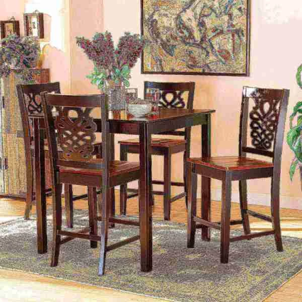 Imbue your dining space with the elegance of the finely crafted Gervais pub set. Made in Malaysia, this wooden set includes four counter stools and one table showcasing a distinctive two-tone dark brown and walnut brown finish. Each stool features a unique, geometric cut out design for added visual appeal, while a scoop seat and footrest lend casual comfort. Requiring assembly, the square tabletop provides ample elbow room for each member of the table. An optimal balance of comfort and modern style, the Gervais pub set enhances any occasion.