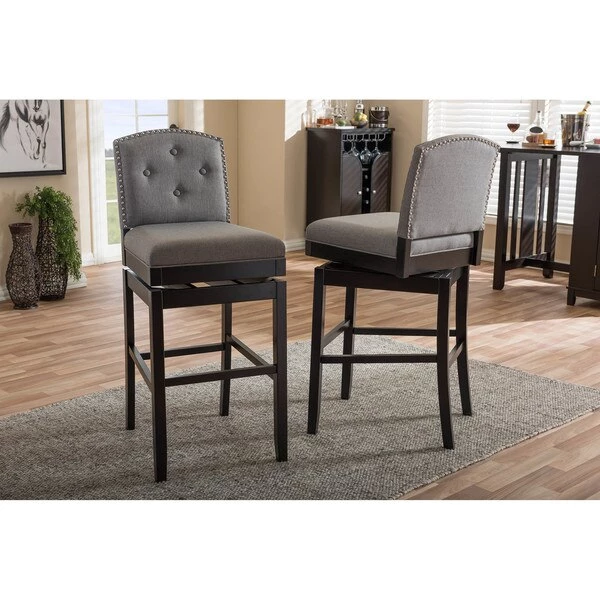 The Ginaro Bar Stool is an ideal choice for any modern bar or pub – providing a comfortable seat at a height! An elegant and sophisticated bar stool with button-tufting design, the Ginaro features curved back with silver nail heads trim on the seat back for a contemporary look. The detailed piping around the seat cushion showcases the clean lines while the tapered legs enhanced with wooden stretchers for durability. Fully upholstered in grey polyester fabric with comfortable foam padding, the Ginaro would fit extremely well in a home bar or restaurant bar environment. A swivel plate connects the base and the seat for easy maneuverability. The bar stool requires assembly.