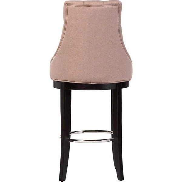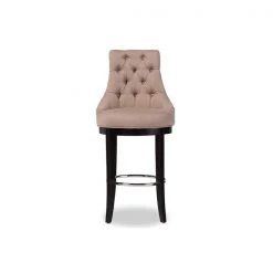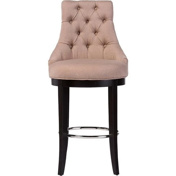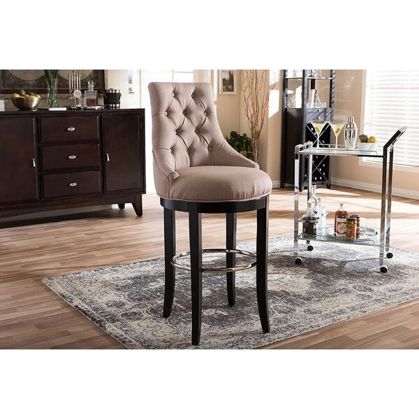 Dine in style. The Harmony Beige Fabric Upholstered Bar Stool is where convenience meets sophisticated dramatic style. The stool makes a statement in style and size with fabric upholstered tufted back making these stools perfect around a bar table. The Harmony barstool features a tall back having beautiful diamond tufts. The curved back fits perfectly against the tightly upholstered round seat. The exposed wood base has tapered legs that flare out as they meet the floor. A metal foot ring, available in chromed steel finish completes the stool. The Harmony requires assembly.