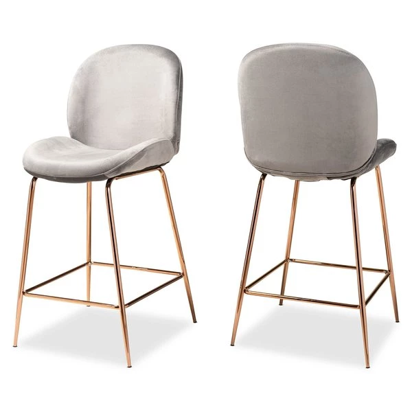 Baxton Studio Lander Glam and Luxe Grey Velvet Upholstered and Rose Gold Finished Metal 2-Piece Counter Stool Set