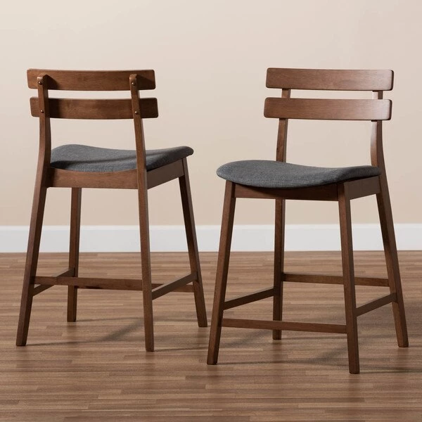 Establish a clean, modern aesthetic in your dining space with the Larine counter stool. Constructed from solid rubberwood, the Larine features a classic walnut brown finish that complements a variety of color palettes. The seat is upholstered in a soft fabric that displays a chic crosshatch pattern. Designed with both style and comfort in mind, the Larine is built with a curved backrest and solid footrest on all four sides. This counter stool is sutiable for use with kitchen counters and pub tables. The Larine counter stool requires assembly.