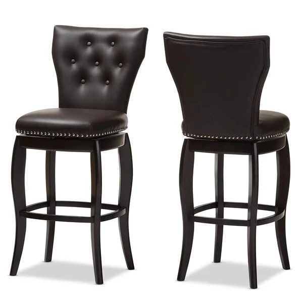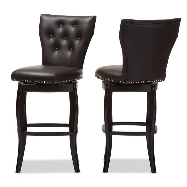Atop swivel base with flared legs, the Leonice swivel barstool is both bold and classic. The silver nail heads trim around the seat complements the cut-out backrest in chic style while button-tufting design pull glamour up to your bar counter. Constructed of solid rubberwood legs, the Leonice swivel barstool is finished in dark espresso for a contemporary look. To add more comforts, the seat is fully padded and upholstered in dark brown faux leather. For sturdiness, wood stretchers are added to serve as footrest and support. Featuring modern and contemporary in style, the graceful lines of the Leonice and the sleek design make this barstool a timeless piece for your bar and dining area. The Leonice requires assembly.
