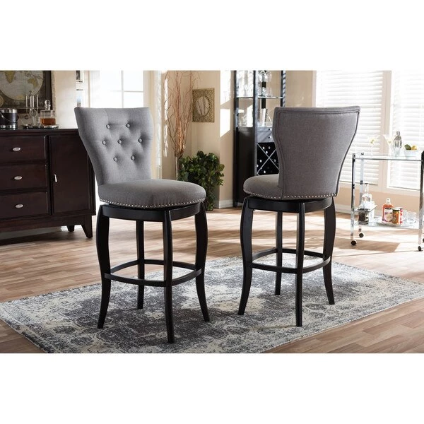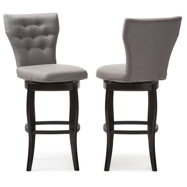 Atop swivel base with flared legs, the Leonice swivel barstool is both bold and classic. The silver nail heads trim around the seat complements the cut-out backrest in chic style while button-tufting design pull glamour up to your bar counter. Constructed of solid rubberwood legs, the Leonice swivel barstool is finished in dark espresso for a contemporary look. To add more comforts, the seat is fully padded and upholstered in grey polyester fabric. For sturdiness, wood stretchers are added to serve as footrest and support. Featuring modern and contemporary in style, the graceful lines of the Leonice and the sleek design make this barstool a timeless piece for your bar and dining area. The Leonice requires assembly.