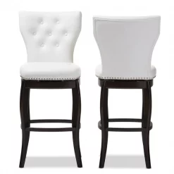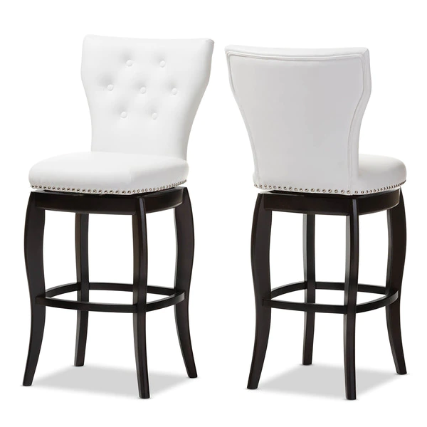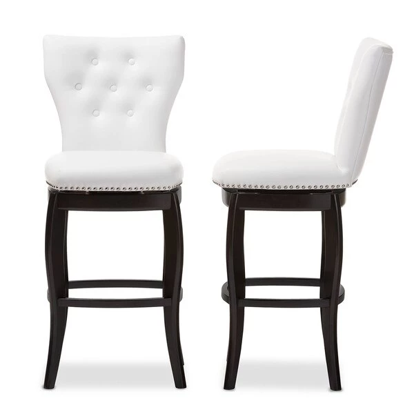 Atop swivel base with flared legs, the Leonice swivel barstool is both bold and classic. The silver nail heads trim around the seat complements the cut-out backrest in chic style while button-tufting design pull glamour up to your bar counter. Constructed of solid rubberwood legs, the Leonice swivel barstool is finished in dark espresso for a contemporary look. To add more comforts, the seat is fully padded and upholstered in white faux leather. For sturdiness, wood stretchers are added to serve as footrest and support. Featuring modern and contemporary in style, the graceful lines of the Leonice and the sleek design make this barstool a timeless piece for your bar and dining area. The Leonice requires assembly.