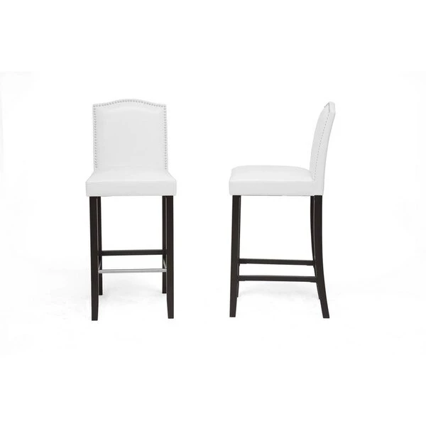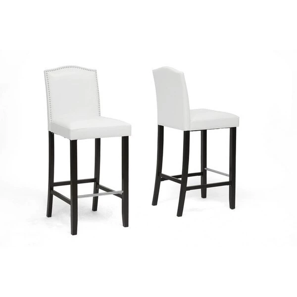 The look of nail head-studded faux leather pairs beautifully with a contemporary update in the lust-worthy Libra Designer Bar Stool. The simple silhouette of this contemporary bar stool is made with a solid rubber wood frame, foam cushioning, iron spring supports, and a stainless steel foot rest. White faux leather pairs with a dark brown frame and non-marking feet for the win. To clean, wipe with a damp cloth. The Libra Stool requires assembly and a rubber mallet. Brown and Black faux leather options are also available (sold separately). 18.5”WX21.5”DX44.5”H SEAT:18.5”WX17.5”DX30.5”H