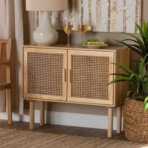 Baxton Studio Maclean Mid-Century Rattan and Natural Brown Finished Wood 2-Door Sideboard Buffet