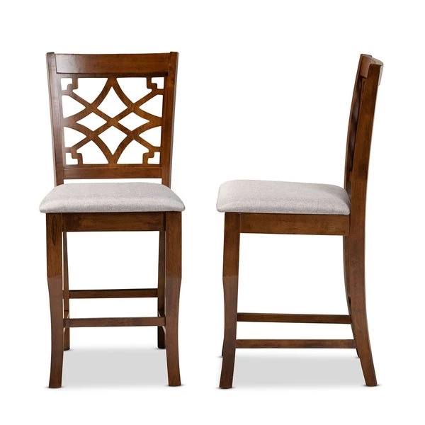Featuring an exquisitely crafted frame, the Nisa counter stool adds elegance to any dining space. This solid wood chair displays a sleek walnut brown finish that complements the light fabric upholstery. Padded with foam for the utmost comfort as you enjoy long dinners, the Nisa features a striking cut-out back for enhanced visual appeal. Constructed at counter height, the stool is suitable for use with pub tables and kitchen counters. The Nisa counter stool is made in Malaysia and requires assembly.