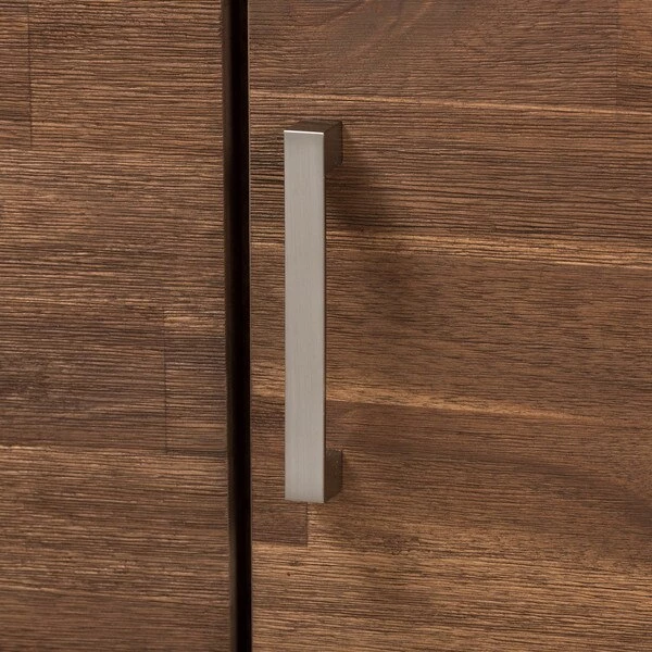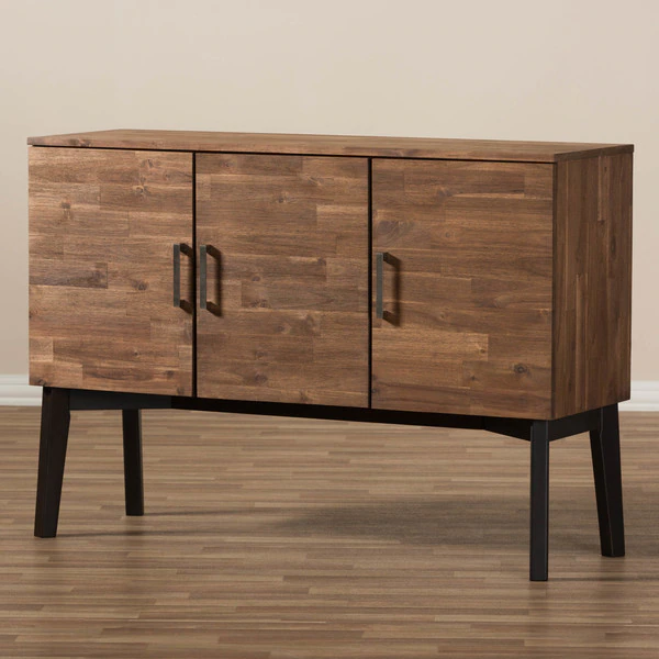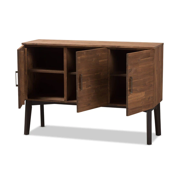 Embrace retro styling to complement your contemporary interior with the handsome tones of the Selena sideboard, caramel brown and dark brown two-tone. Constructed of solid Acacia wood and rubberwood frame and legs, the Selena 3-door sideboard buffet is built for durability with lasting good looks. Three doors open up to ample storage space for your book collection, board games or even fine china for versatility. Slim drawer metal handles provide simple functionality with minimalist looks. Versatile in styling, the sideboard complements mid-century modern themes to retro-inspired interiors. The Selena requires legs assembly.