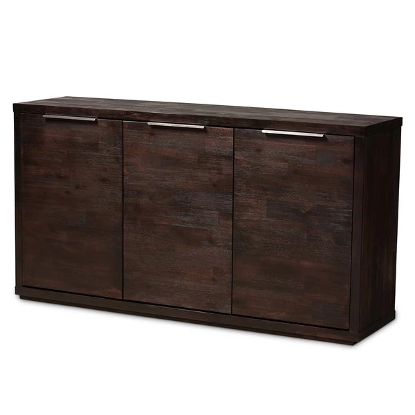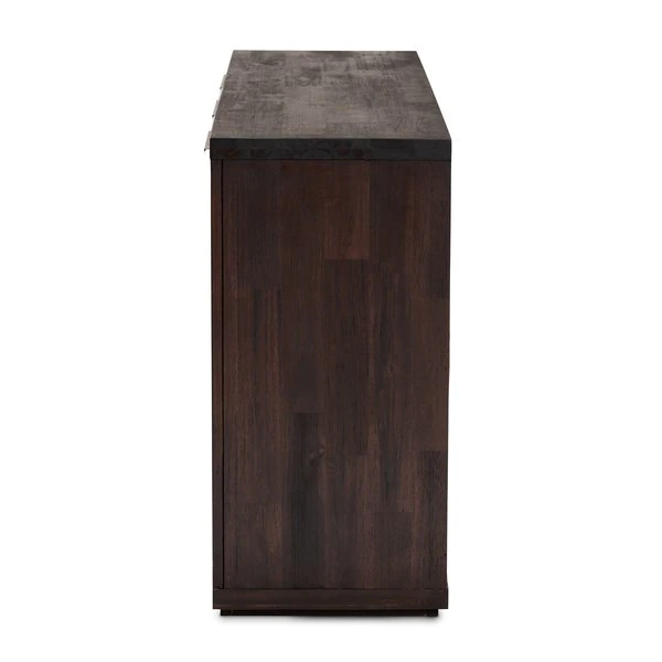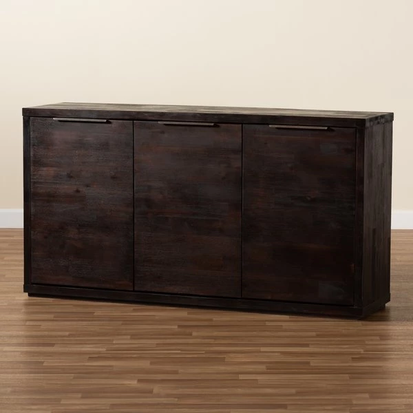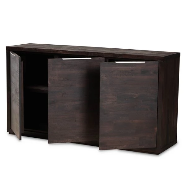 The striking presence of the Titus sideboard alleviates overcrowded dining spaces in contemporary style. Made in Malaysia, the Titus is comprised of sturdy wood showcasing a rich dark brown finish. Four spacious shelves located behind the doors provide ample storage space for plates, glassware, and more. Fully assembled, the Titus is fitted with minimalist silver-tone metal handles for a sleek and ergonomic design. A sizeable upgrade to any kitchen or dining space, the Titus sideboard is a delightful addition to the modern home.