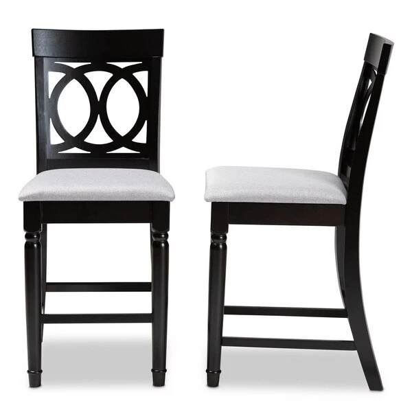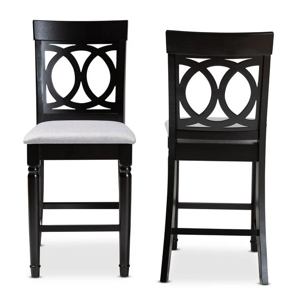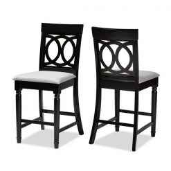 An elegant silhouette is paired with comfortable seating to make the Verina counter stool a timeless addition to any dining space. This solid oak wood chair displays a sleek espresso brown finish that complements the light polyester fabric upholstery. Padded with foam for the utmost comfort as you enjoy long dinners, the Verina features a striking cut-out back for enhanced visual appeal. Ball turned legs add a classic, refined touch. Constructed at counter height, the Verina is suitable for use with pub tables and kitchen counters. The Verina counter stool requires assembly.