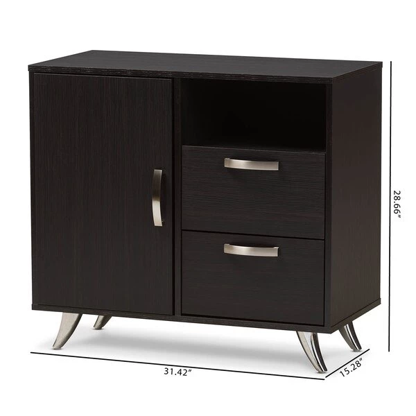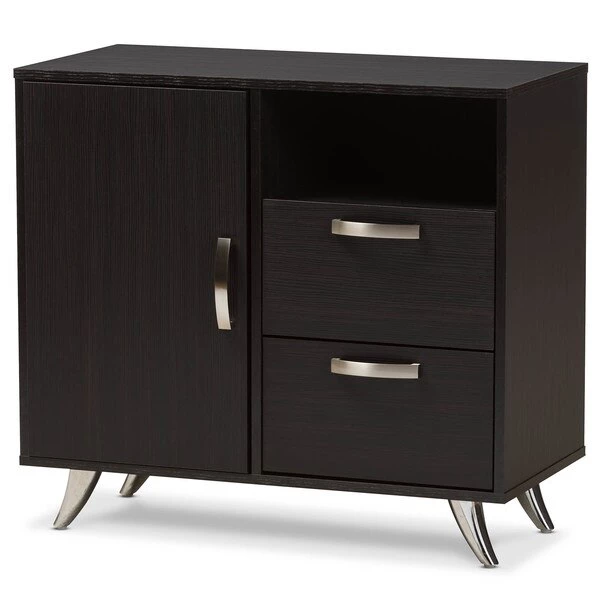 Opt for a minimalist look in your living room with the Warwick sideboard. Dark expresso brown finish instils luxe style in your masculine or modern interior. Constructed of engineered wood and MDF boards for sturdiness, the sideboard features two compartments with door, an open shelf and two pull-out drawers on pre-installed drawer slide for handy storage to stash knick-knacks in your living or dining area for practicality. Silver-finished metal legs and handles complement your contemporary décor. The Warwick requires assembly.