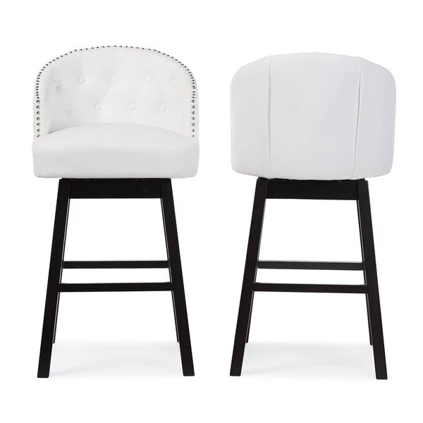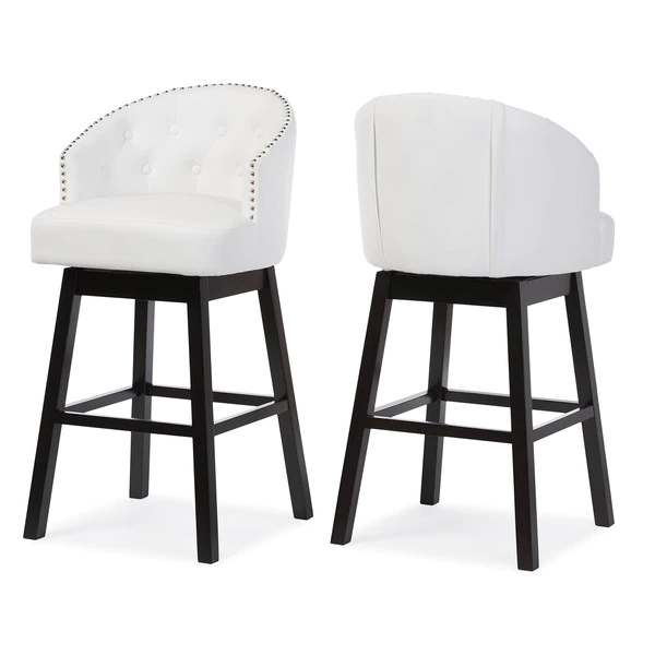 Featuring elegant and sophisticated design, the Avril Swivel Barstool is another piece of our modern and contemporary collection. The barstool has a wide curved button-tufted seat back. Underneath the seat, it has a metal plate supporting the swivel mechanism. Four straight legs finished in dark espresso brown and built with solid rubberwood supporting the seat sturdily. Fully upholstered in faux leather, the wide seating area is padded throughout for a comfortable reign. There is visible showed stitching's on the back and seat to enhance the class and elegance of this barstool. The button-tufting and nail heads trim on the edges reconfirm the modern and contemporary design. This piece would fit extremely well in a hotel bar or restaurant bar environment with it swivel function. The barstool is offered in set of two and it requires assembly.