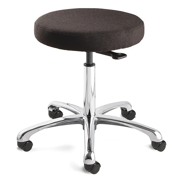 Round Stool, No, Weight Capacity 300 lb, Seat Width 15 in, Seat Depth 16 in, Seat Height Range 19-1/2 in to 27 in, Overall Height 27 in, Color Black, Seat Material Fabric, Base Material Polished Aluminum, Number of Casters 5, Caster Type Glides, Caster Material Mushroom Glides, Features 5-Star Polished Aluminum Base, Mushroom Glides, Upholstered Fabric Stool, Partially Assembled, ANSI/BIFMA X5.1-2002, CA. TB117 Standards