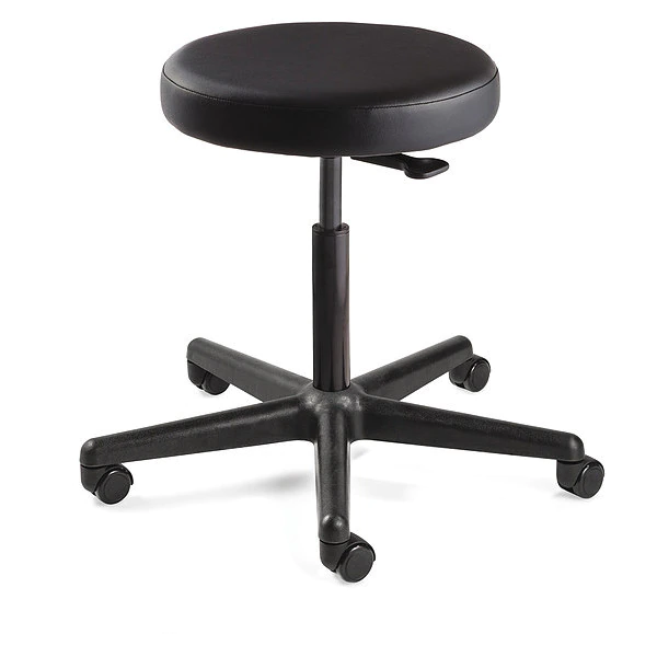 Round Stool, No, Weight Capacity 300 lb, Seat Width 16 in, Seat Depth 16 in, Seat Height Range 17 in to 22 in, Overall Height 22 in, Color Black, Seat Material Vinyl, Base Material Nylon, Number of Casters 5, Caster Type Dual Wheel, Caster Material Nylon Core with Urethane Tread, Features Upholstered Vinyl Stool, 5-Star Black Nylon Base, (5) Casters, Partially Assembled, ANSI/BIFMA X5.1-2002, CA. TB117 Standards