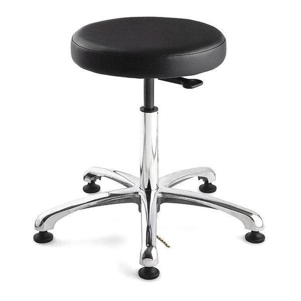 ESD Backless Pneumatic Stool, Weight Capacity 300 lb, Seat Height Range 21 1/2 in to 31 1/2 in, Seat Depth 15 in, Seat Width 15 in, Color Black, Material ESD Vinyl, Base 5-Star Polished Aluminum, Features Static Control ESD, Includes (5) ESD Mushroom Glides, Partially Assembled, Standards ANSI/BIFMA, CAL 117