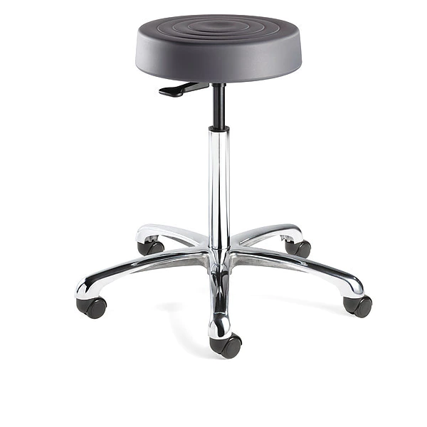 Round Pneumatic Stool, No, Weight Capacity 300 lb, Seat Width 14 1/2 in, Seat Depth 14 1/2 in, Seat Height Range 17 in to 22 in, Overall Height 22 in, Color Gray, Seat Material Polyurethane, Base Material Polished Aluminum, Number of Casters 5, Caster Type Dual Wheel, Caster Material Nylon Core with Urethane Tread, Features 5-Star Polished Aluminum Base, Dual-Wheel Hard Floor Casters, ErgoLux Backless Stool, Soft Polyurethane Seat, Partially Assembled, ANSI/BIFMA Standards