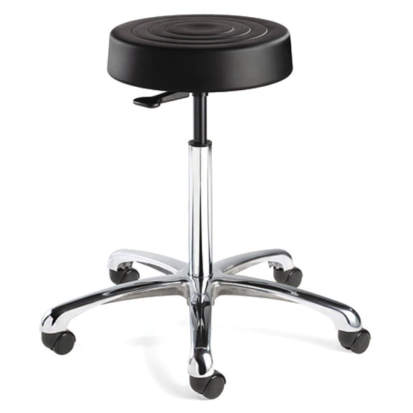 Round Pneumatic Stool, No, Weight Capacity 300 lb, Seat Width 14 1/2 in, Seat Depth 14 1/2 in, Seat Height Range 20 in to 27-1/2 in, Overall Height 27 1/2 in, Color Black, Seat Material Polyurethane, Base Material Polished Aluminum, Number of Casters 5, Caster Type Dual Wheel, Caster Material Nylon Core with Urethane Tread, Features 5-Star Polished Aluminum Base, Dual-Wheel Hard Floor Casters, ErgoLux Backless Stool, Soft Polyurethane Seat, Partially Assembled, ANSI/BIFMA Standards