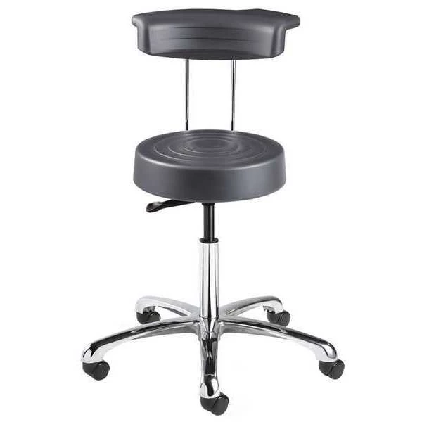 Ergonomic Stool, Yes, Weight Capacity 300 lb, Seat Width 14 1/2 in, Seat Depth 14 1/2 in, Seat Height Range 17 in to 22-1/2 in, Overall Height 22 1/2 in, Color Gray, Seat Material Polyurethane, Base Material Polished Aluminum, Number of Casters 5, Caster Type Dual Wheel, Caster Material Nylon Core with Urethane Tread, Features 5-Star Polished Aluminum Base, Dual-Wheel Hard Floor Casters, ErgoLux Stool w/Backrest, Soft Polyurethane Seat, Partially Assembled, ANSI/BIFMA Standards
