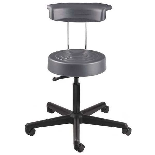 Ergonomic Stool, Base Design 5-Star, Mobility Mobile, Backrest Yes, Base Color Black, Built-In Tool Tray No, Includes Footring Yes, Maximum Seat Height 22 1/2 in, Minimum Seat Height 18 in, Overall Height 23 in, Seat Adjustment Type Pneumatic Lever, Seat Diameter 14 1/2 in, Seat Shape Round, Seat Width Not Applicable, ESD Conductive No, Assembled Unassembled, For Floor Surface Hard Surfaces, Load Capacity 300 lb, Puncture Resistant Yes, Seat Color Gray, Seat Thickness 3 1/2 in