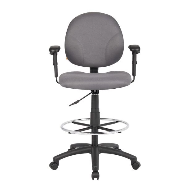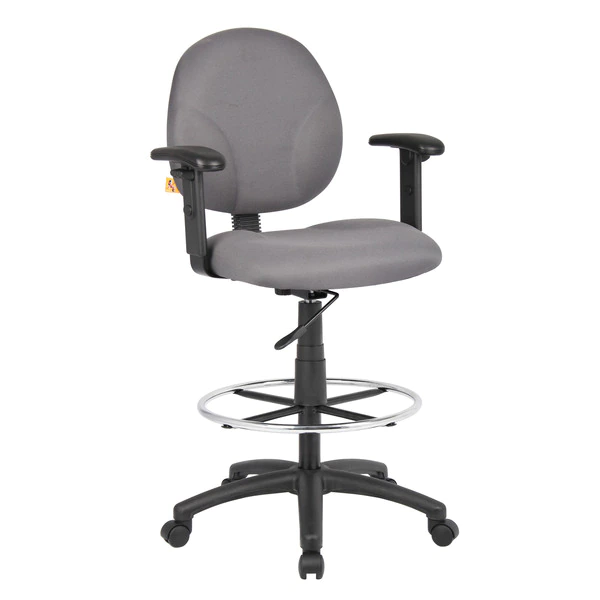 The striking stand up drafting stool with foot rest in grey is made with a nice crepe fabric seat and matching back. The drafting stool provides a pneumatic gas lift mechanism for easy height adjustment options, as well as adjustable arms, making this a great stool for most any desk or drafting table. The stool also features a sturdy 27 inch nylon base with 2 inch nylon dual wheel castors, adjustable arms and offers a 275 lb. capacity.