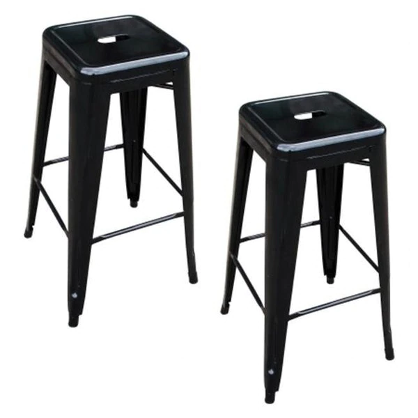 These AmeriHome Metal Bar Stools are durable enough for use in the shop and stylish enough to use in the kitchen game room bar basement dorm room or loft. Ideal for small spaces the bar stools easily and neatly stack together making them easy to stash out of the way for storage. A handle in the seat makes the stools easy to pick up and move. Lightweight and sturdy each stool weighs only 12.5 lbs. but is strong enough to hold up to 330 lbs. Each Metal Bar Stools has a brace under the seat that provides additional support and stability. No-mar rubber feet keep them from sliding and scratching hardwood floors. They bar stools are painted a deep black with a scratch-resistant powder coat paint finish. Each Bar Stool stands 30 inches tall with a seat measuring 12 in L x 12 in W. Sold in a set of 2. Features: Industrial modern look for kitchen dorm or shop Scratch-resistant powder coated paint finish Easily stacks for convenient storage X-brace support under the seat for stability and durability Seat height: 30 in. Seat size: 12 in L x 12 in W 17 in W x 17 in D x 30 in H Weight Capacity: 330 lbs. Each stool weighs 12.5 lbs. Sold in a set of 2