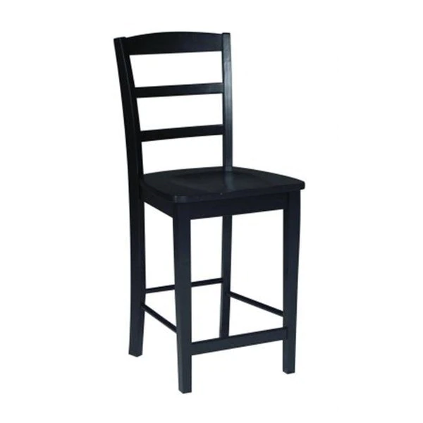 Dining Essentials Madrid Counter Height Stool.Box seat construction.Ready to assemble.Finish: Black.Materials: Solid Wood.Arms: Without Arms.Back: with Back.Swivel: Does Not Swivel.Width: 18".Seat Width: 18.11".Seat Height: 24".Seat Depth: 16.14".Height: 3' 5".BackToFront: 20".