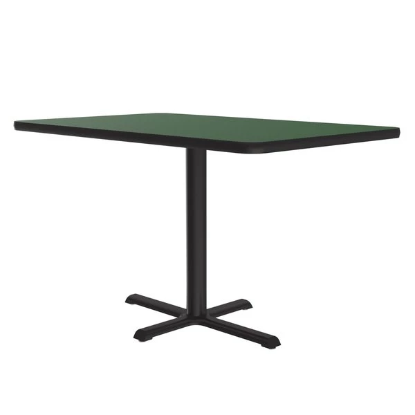 Correll Café, & Break Room Tables. Built for the harsh demands of Commercial use. 30"x48" Green Rectangular high pressure laminate Top. Laminate surface resists scratches and stains and offers a hard, flat surface. Top also features a Backer sheet on underside of table that helps protect against moisture entering the underside of the table causing warping. Black textured cast iron spider and cross base with a steel column for strength and durability. Bases include nylon leveling guides for study placement. Black T-Mold edges provide protection to both the table and your walls. Meets BIFMA Standards. . YOU CAN COUNT ON CORRELL: Correll was established in 1969 and has been in business for over 50 years. With our out Standing Customer Service, innovative new product lines, and the largest selection of Folding Tables available from any manufacturer, now, more than ever, you can count on Correll.