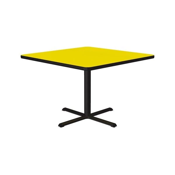 Correll Café, & Break Room Tables. Built for the harsh demands of Commercial use. Standard 29" high table. 42" Square Yellow high pressure laminate Top. Laminate surface resists scratches and stains and offers a hard, flat surface. Top also features a Backer sheet on underside of table that helps protect against moisture entering the underside of the table causing warping. Black textured cast iron spider and X-base with 3" steel column for strength and durability. Bases include nylon leveling guides for study placement. Black T-Mold edges provide protection to both the table and your walls. Meets BIFMA Standards. . YOU CAN COUNT ON CORRELL: Correll was established in 1969 and has been in business for over 50 years. With our out Standing Customer Service, innovative new product lines, and the largest selection of Folding Tables available from any manufacturer, now, more than ever, you can count on Correll.