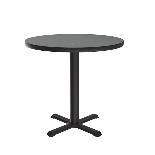 Correll Café, & Break Room Tables. Built for the harsh demands of Commercial use. Standard 29" high table. 42" Round Montana Granite high pressure laminate Top. Laminate surface resists scratches and stains and offers a hard, flat surface. Top also features a Backer sheet on underside of table that helps protect against moisture entering the underside of the table causing warping. Black textured cast iron spider and X-base with 3" steel column for strength and durability. Bases include nylon leveling guides for study placement. Black T-Mold edges provide protection to both the table and your walls. Meets BIFMA Standards. . YOU CAN COUNT ON CORRELL: Correll was established in 1969 and has been in business for over 50 years. With our out Standing Customer Service, innovative new product lines, and the largest selection of Folding Tables available from any manufacturer, now, more than ever, you can count on Correll.