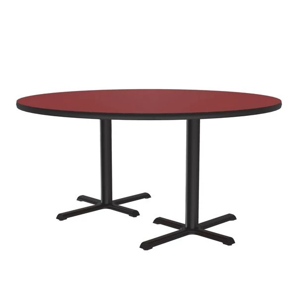 Correll Café, & Break Room Tables. Built for the harsh demands of Commercial use. 60" Red Round high pressure laminate Top. Laminate surface resists scratches and stains and offers a hard, flat surface. Top also features a Backer sheet on underside of table that helps protect against moisture entering the underside of the table causing warping. Black textured cast iron spider and cross base with a steel column for strength and durability. Bases include nylon leveling guides for study placement. Black T-Mold edges provide protection to both the table and your walls. Meets BIFMA Standards. . YOU CAN COUNT ON CORRELL: Correll was established in 1969 and has been in business for over 50 years. With our out Standing Customer Service, innovative new product lines, and the largest selection of Folding Tables available from any manufacturer, now, more than ever, you can count on Correll.