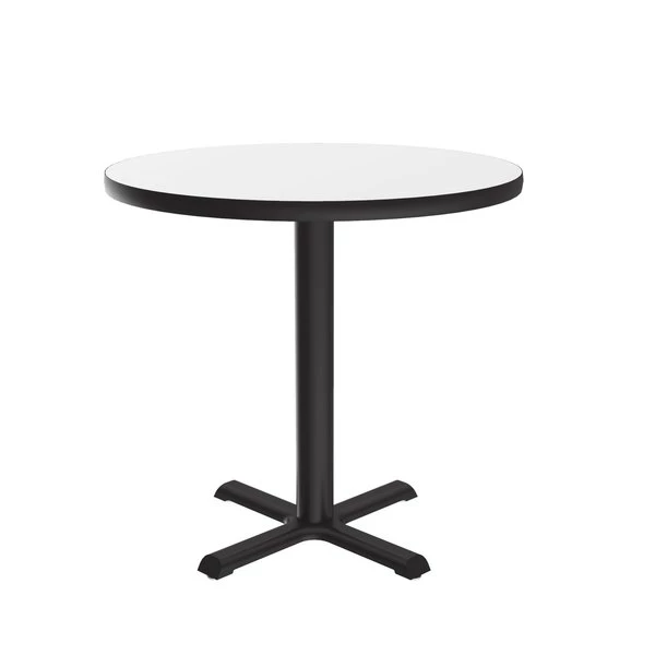 Correll Café, & Break Room Tables. Built for the harsh demands of Commercial use. Standard 29" high table. 42" Round White high pressure laminate Top. Laminate surface resists scratches and stains and offers a hard, flat surface. Top also features a Backer sheet on underside of table that helps protect against moisture entering the underside of the table causing warping. Black textured cast iron spider and X-base with 3" steel column for strength and durability. Bases include nylon leveling guides for study placement. Black T-Mold edges provide protection to both the table and your walls. Meets BIFMA Standards. . YOU CAN COUNT ON CORRELL: Correll was established in 1969 and has been in business for over 50 years. With our out Standing Customer Service, innovative new product lines, and the largest selection of Folding Tables available from any manufacturer, now, more than ever, you can count on Correll.