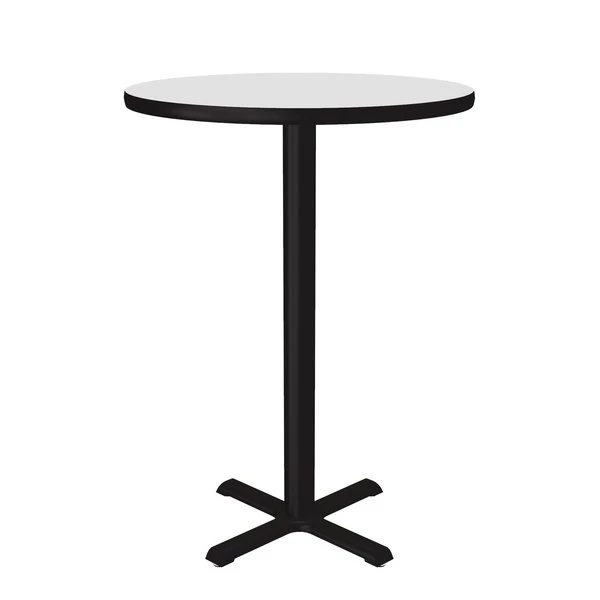 Correll Café, & Break Room Tables. Built for the harsh demands of Commercial use. These 42" bar height tables are the perfect height for standing or use with stools. 24" round White Rectangular high pressure laminate Top. Laminate surface resists scratches and stains and offers a hard, flat surface. Top also features a Backer sheet on underside of table that helps protect against moisture entering the underside of the table causing warping. Black textured cast iron spider and X-base with 3" steel column for strength and durability. Bases include nylon leveling guides for study placement. Black T-Mold edges provide protection to both the table and your walls. Meets BIFMA Standards. . YOU CAN COUNT ON CORRELL: Correll was established in 1969 and has been in business for over 50 years. With our out Standing Customer Service, innovative new product lines, and the largest selection of Folding Tables available from any manufacturer, now, more than ever, you can count on Correll.